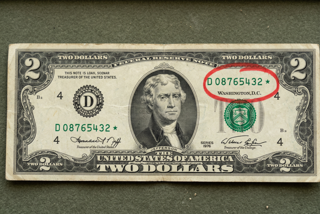 A star note is one of the first things collectors look for. On a 1976 2 dollar bill, the star replaces the suffix letter at the end of the serial number. It marks the note as a replacement note printed to substitute for one with a production problem.