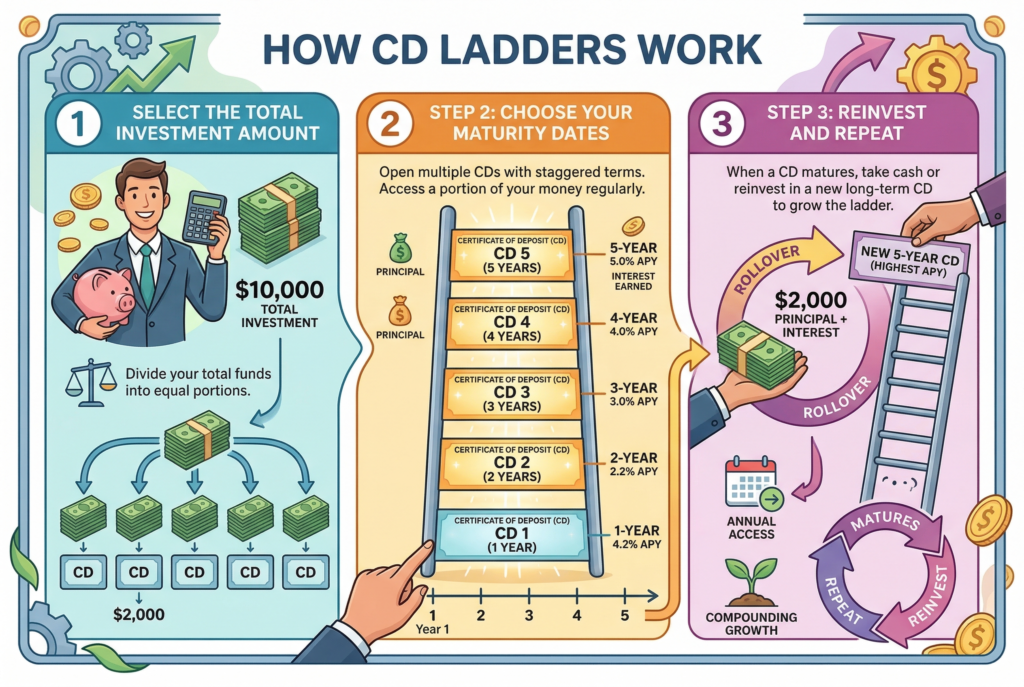 A CD ladder is a strategy where you divide your investment across multiple Certificates of Deposit (CDs) with varying maturity dates. By using this approach, you can earn higher interest rates on long-term CDs while still ensuring regular access to your money as each CD matures. Instead of locking up all your money in one long-term CD, a ladder allows you to balance the need for higher returns with the flexibility of accessing portions of your funds at regular intervals.