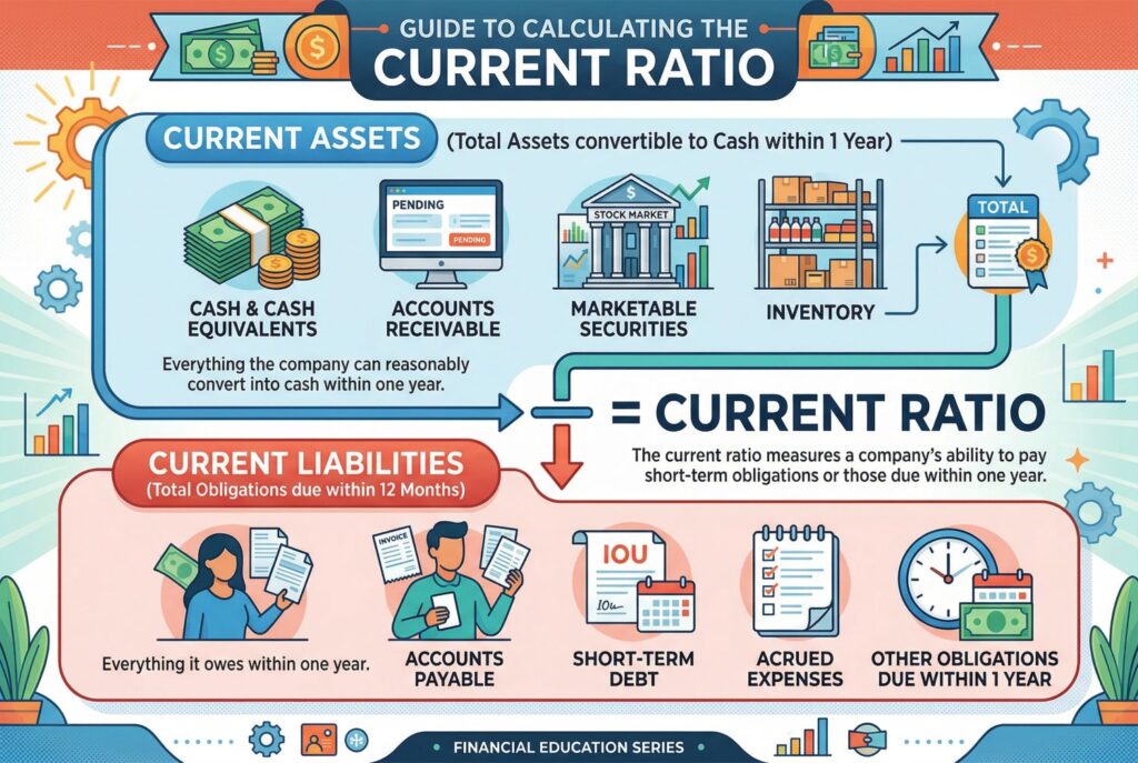 That’s it. If you want to know how to calculate the current ratio, you divide everything the company can reasonably convert into cash within one year by everything it owes within one year. Current assets often include cash, accounts receivable, marketable securities, and inventory. Current liabilities often include accounts payable, short term debt, accrued expenses, and other obligations due within 12 months.