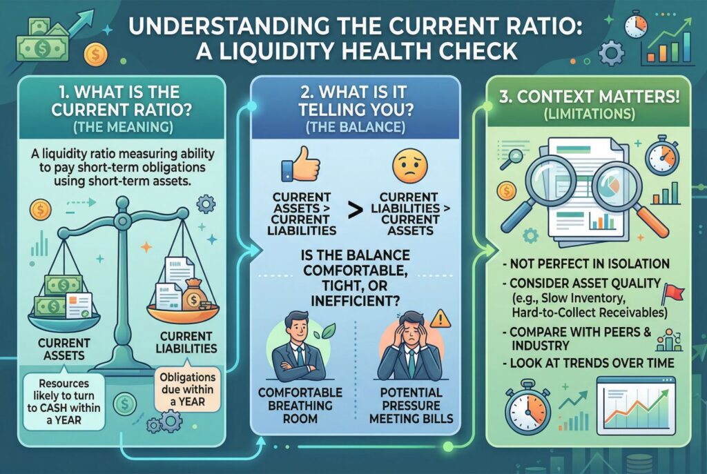 So, what is the current ratio really telling you? It tells you whether the balance between current assets and current liabilities looks comfortable, tight, or potentially inefficient. If current assets are higher than current liabilities, the company usually has more breathing room. If current liabilities are greater, the business may face pressure meeting bills, payroll, supplier payments, or debt coming due.