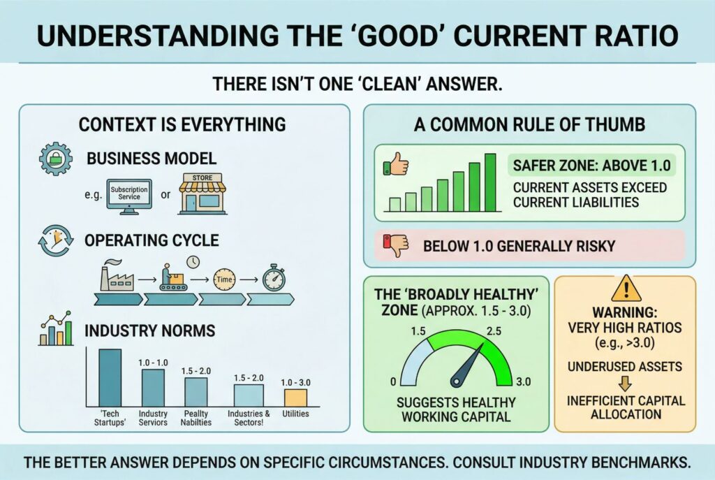 When people ask what is a good current ratio, they usually want one clean answer. In practice, the better answer is that a “good” ratio depends on the business model, operating cycle, and industry norms. Still, many finance guides suggest that a ratio above 1.0 is generally safer than one below 1.0, because it means current assets exceed current liabilities. Some sources also frame roughly 1.5 to 3.0 as a broadly healthy zone, while warning that very high ratios can sometimes signal underused assets or inefficient capital allocation.