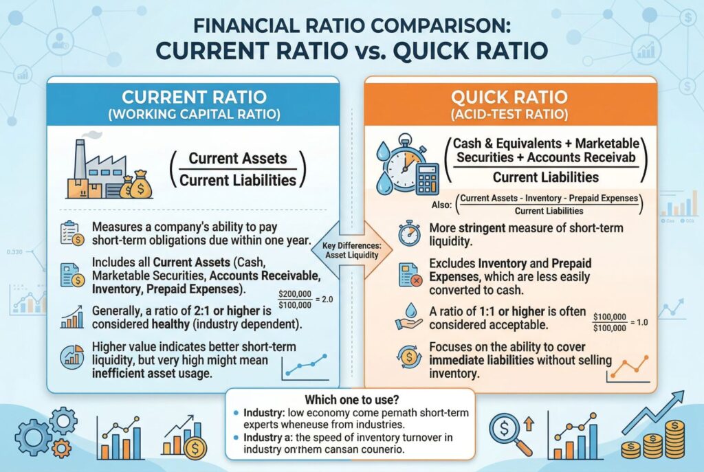 The quick ratio is closely related, but stricter. While the current ratio uses all current assets, the quick ratio removes inventory and other less liquid current assets. In other words, it focuses on quick assets, which are assets that can be converted to cash more quickly and reliably, such as cash, marketable securities, and receivables.