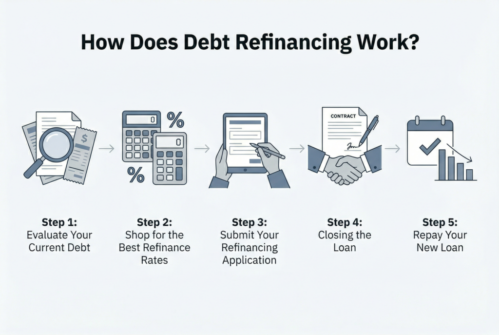 Debt refinancing involves replacing your existing debt, whether it’s a mortgage, auto loan, student loan, or other forms of credit, by taking out a new loan with better terms. The goal is to replace the old debt with a loan that offers lower interest rates, better payment terms, or even cash-out options to use for other purposes. Essentially, you’re swapping your old debt for a new one that might be more manageable or better suited to your current financial situation.