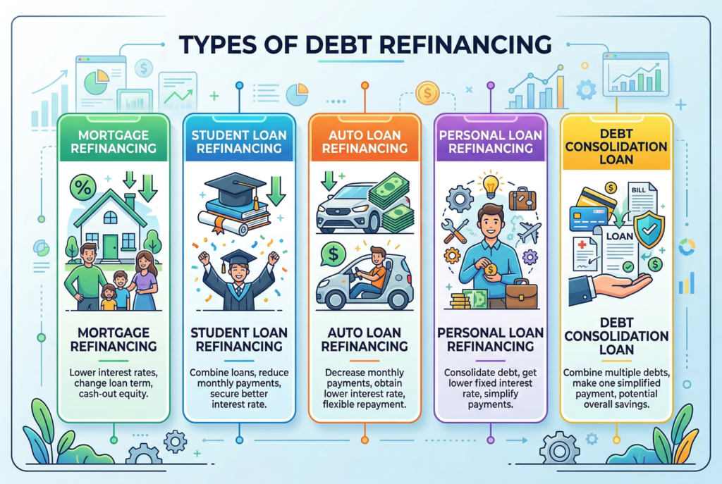 If you have multiple high-interest debts, a debt consolidation loan can combine them into one loan with a single monthly payment. This type of refinancing can help simplify your finances and reduce the amount of interest you pay over time. Debt consolidation loans can be secured (using collateral like your home) or unsecured, depending on your financial situation.
