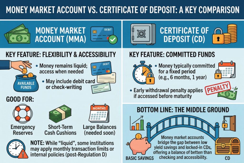 A money market account isn’t the same thing as a CD. With a CD, your money is typically committed for a fixed period unless you’re willing to accept an early withdrawal penalty. A money market account doesn’t work like that. The money remains liquid, which means you can usually access it whenever you need it. Some accounts even come with debit card access or check-writing privileges, which makes them more flexible than a basic savings account in everyday use.