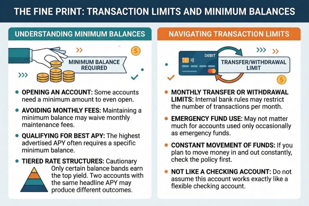 Transaction rules matter too. Many banks still preserve internal monthly transfer or withdrawal limits even though the older regulatory rule changed. If you’re using the account as a true emergency fund, that may not matter much. But if you plan to move money in and out constantly, you need to check the policy before assuming the account works like a checking account.