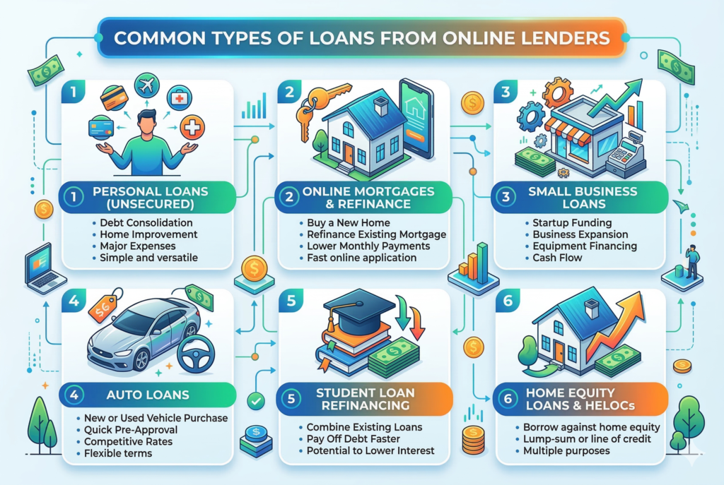 These lenders may offer several types of financing, including personal loans, business loans, auto refinancing, student loan refinancing, and in some cases mortgages or home improvement loans. Their main appeal is convenience. Borrowers can usually start the process on a phone or laptop, review rates, and move forward without in-person appointments.