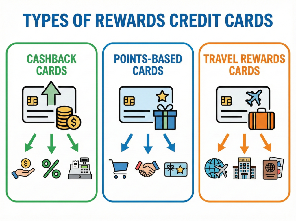 There are several types of rewards credit cards, each offering unique advantages. The most common types include cashback cards, points-based cards, and travel rewards cards.
