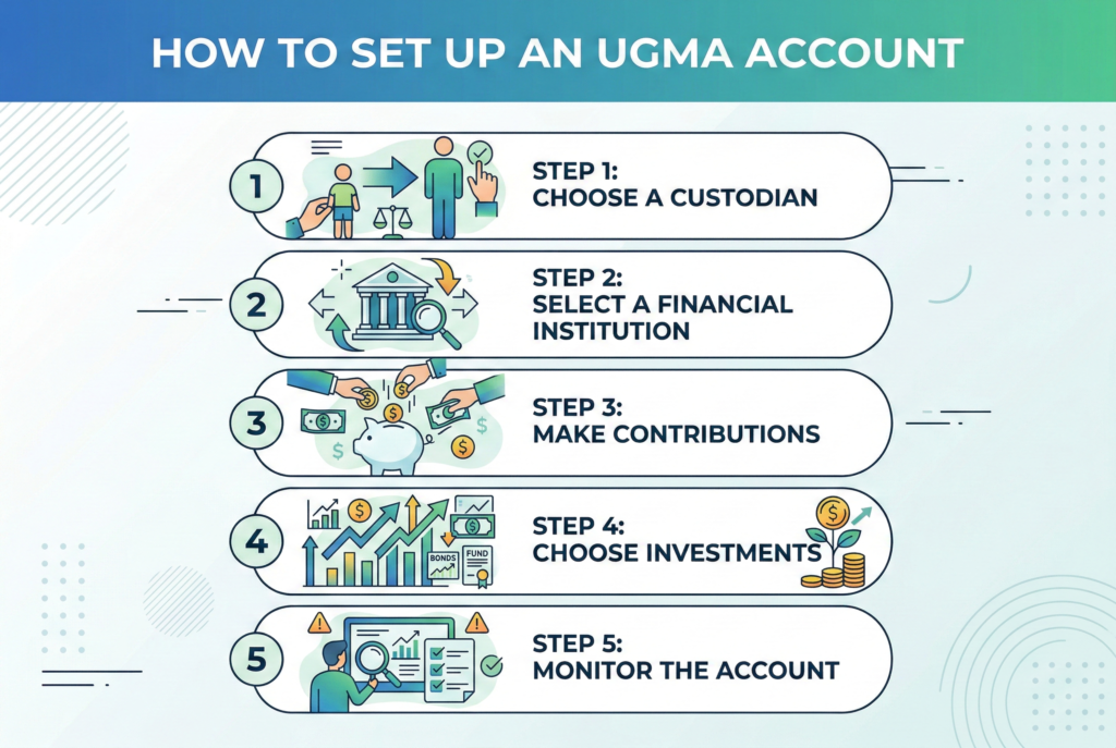 To open an UGMA account, you must choose a custodian (typically a parent, but can also be a grandparent or another adult) and a financial institution (such as a bank or brokerage firm). The custodian manages the account until the child reaches adulthood.