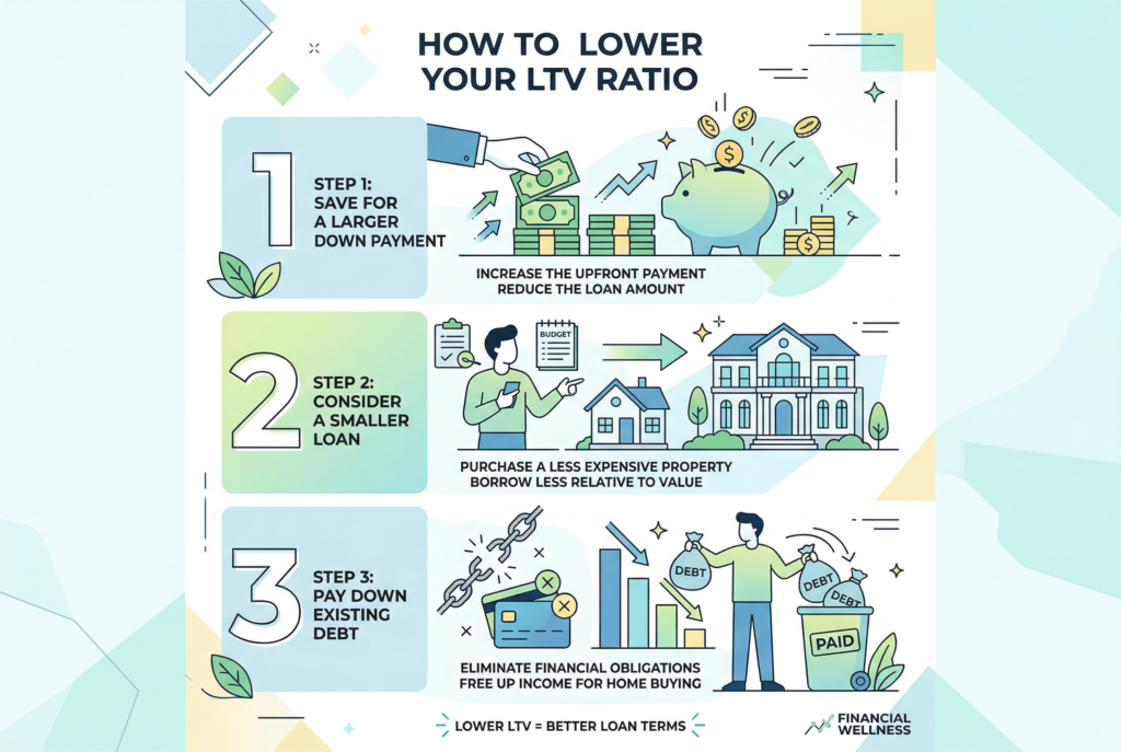 The easiest way to lower your LTV ratio is to increase your down payment. If your current LTV is 90%, increasing your down payment by 5% or 10% will significantly reduce your LTV and may help you qualify for better loan terms.
