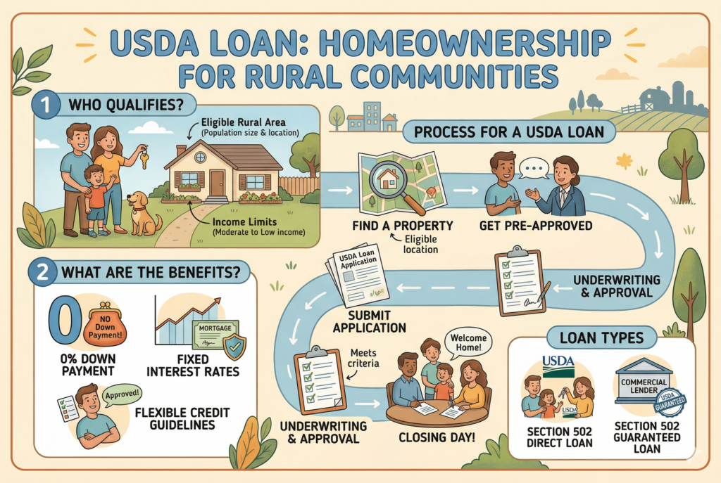 A USDA loan is backed by the U.S. Department of Agriculture and is designed for certain eligible rural and suburban homebuyers. It may allow low or no down payment financing for qualified borrowers and properties. This loan type can be a useful option for buyers in eligible areas who meet income and property requirements.