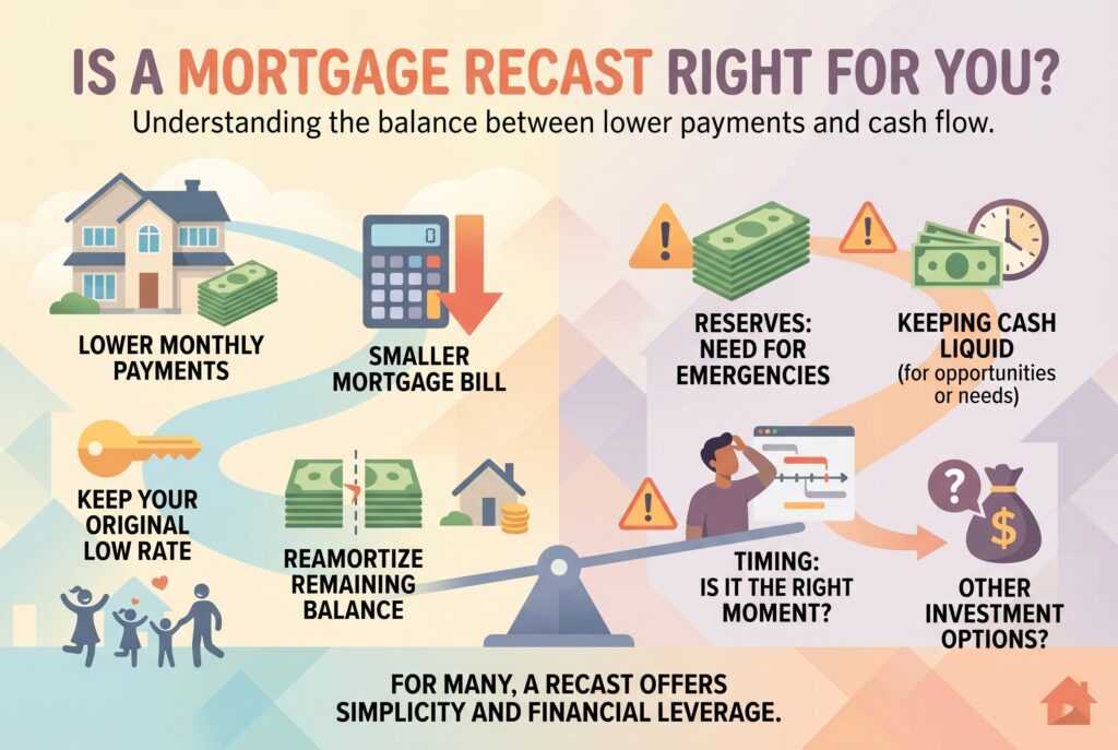 That doesn’t mean it’s automatically the right answer. You still need to think about reserves, timing, and whether keeping cash more liquid matters more right now. But for many homeowners, especially those sitting on a great rate they don’t want to lose, recasting mortgage options offer a rare combination of simplicity and financial leverage.