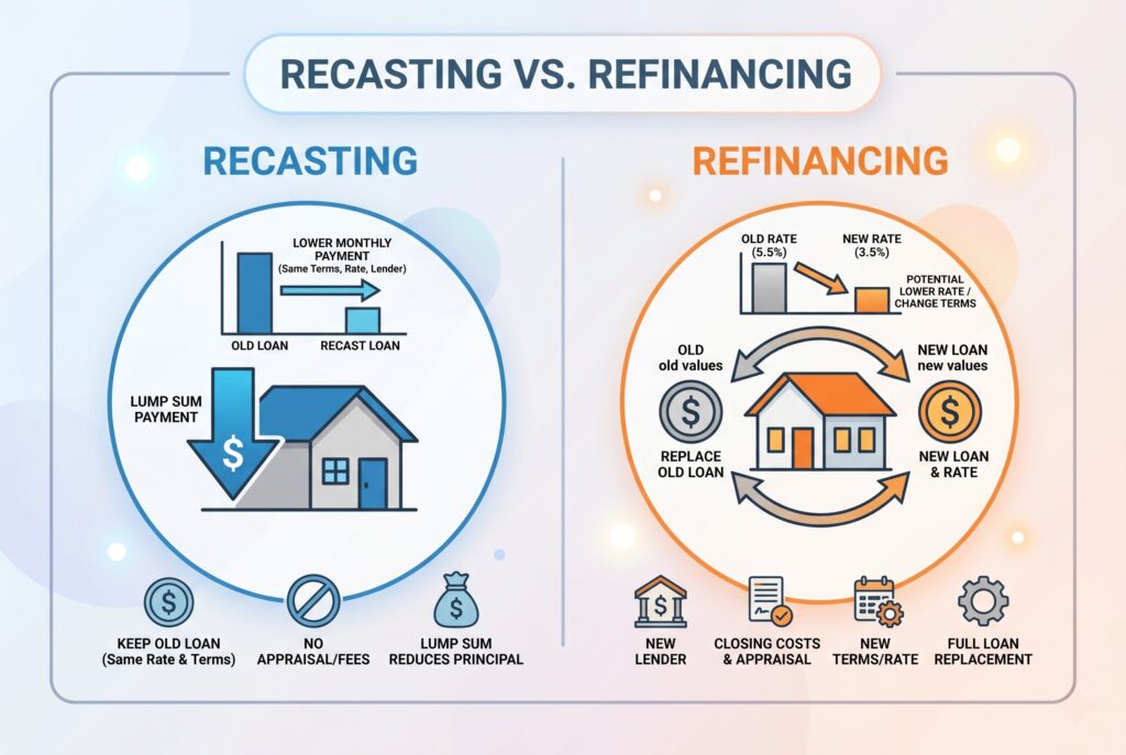 This is where a lot of homeowners make the wrong comparison at first. They assume that if they want a lower monthly payment, the only answer is refinancing. But in many cases, recasting mortgage options is the smarter move.