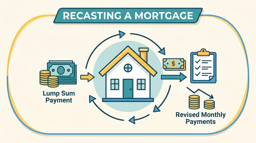 If you have a lump sum available and want lower payments without sacrificing a low interest rate, a mortgage recast can be one of the smartest moves available. It lets you use principal curtailment strategically, keep your original loan, and reamortize the remaining balance into a more manageable monthly obligation.