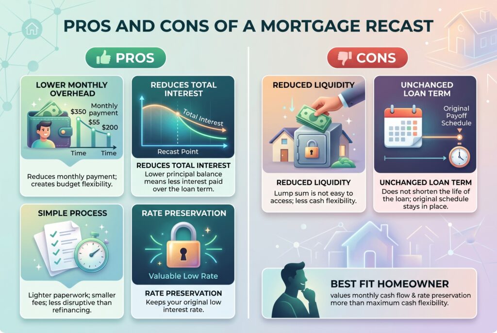 A mortgage recast has clear strengths, but it isn’t perfect for everyone. The biggest benefit is lower monthly overhead. If you want more room in your budget without giving up a valuable low rate, recasting can be an elegant solution. It also reduces total interest over the life of the loan because the principal balance is lower from that point forward.