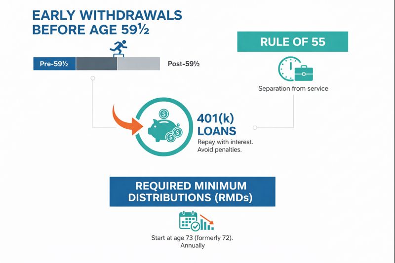 With early withdrawals before age 59½, the IRS generally treats the money as taxable income and adds a 10% early-withdrawal penalty. There are limited exceptions, but in most cases, tapping your 401(k) early comes at a cost.