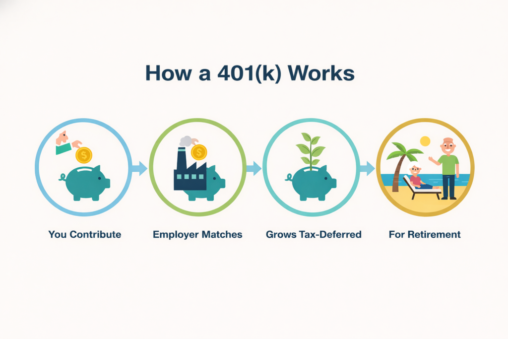 A 401(k) is a workplace retirement account that lets you save directly from your paycheck. The money goes in automatically, before you even see it hit your bank account, which makes saving easier and more consistent.