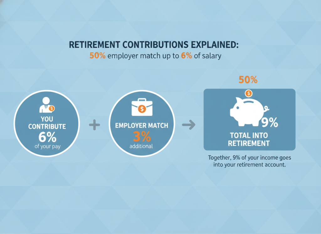 If your employer offers a 50% match on contributions up to 6% of your salary, this means: You contribute 6% of your pay while your employer contributes an additional 3%. Together, 9% of your income goes into your retirement account.