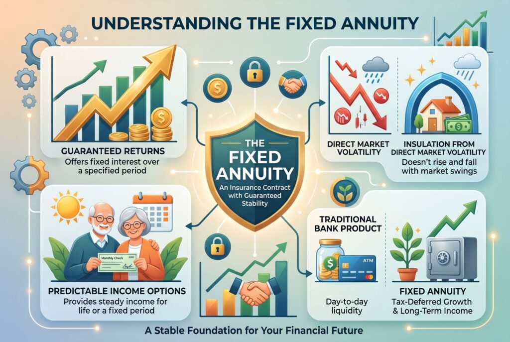 What is a fixed annuity? At its core, it’s an insurance contract that offers guaranteed returns, predictable income options, and insulation from direct market volatility. Unlike stocks, your principal doesn’t rise and fall with market swings. Unlike many ordinary bank products, the appeal is usually centered on a stronger long-term income structure and tax-deferred growth rather than day-to-day liquidity.