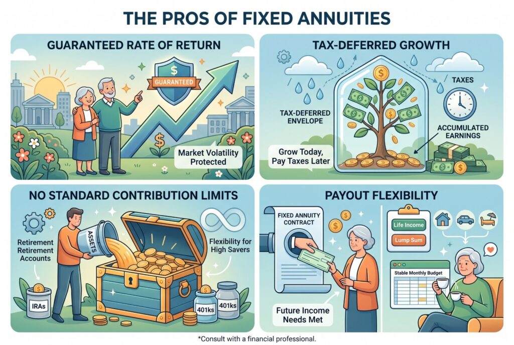 - No standard contribution limits: Unlike many retirement accounts, fixed annuities generally don’t impose strict annual contribution caps. This offers flexibility for individuals looking to allocate additional funds into more stable assets.