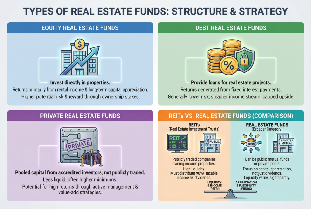 Real estate funds come in several forms, each with its unique structure and investment strategy. Understanding the differences can help you choose the type that best aligns with your financial goals.