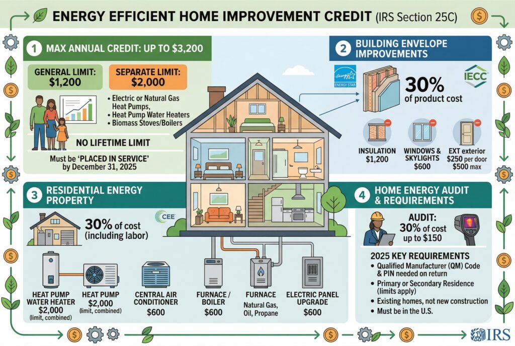 It’s also smart to verify product eligibility before installation. The IRS says that for certain 25C property placed in service after December 31, 2024, the item must be produced by a qualified manufacturer, and the taxpayer must include the required product identification information on the tax return. IRS FAQ guidance further explains that PIN-related requirements expand for property placed in service in 2026.